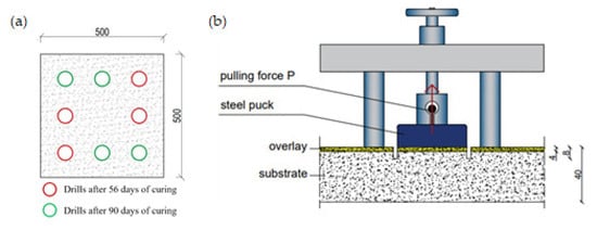 Four boreholes were drilled on the prepared panels after each curing time as shown in Figure 2a. The holes were drilled with a 50 mm inside diameter, using diamond saw to a depth of 8 mm. This will clarify the tests directly on the near-surface layer, which was defined as a range from 0 to 4 mm depth (Figure 2b). According to the standard [], to achieve meaningful results, it was necessary to place the edge of the disc a minimum of 50 mm from the edge of the specimen. After drilling, the surface of the discs was vacuumed and cleaned with acetone without compromising the integrity of the coating. Then, in order to connect the Proceq Dy-216 test device to the specimen, the steel discs (cleaned with acetone) were glued to the wells with Poxipol two-component adhesive. The glue was applied to the surface of the puck and the surface of the sample, then positioning the puck by carefully pressing it to remove air bubbles. The adhesive had no effect on the test specimen. Once the adhesive was fully cured, the test was proceeded. The connection between the puck and the test instrument was screwed into the puck. The machine was levelled and programmed to complete the test in a maximum of 100 s at a loading rate of 0.05 MPa/s. The result of the test is recorded on the instrument along with a graph of load increase over time. After entering the relevant data into the apparatus, the pull-off strength was automatically calculated from Equation (3). Regarding the work of [] and [] where the pull-off strength between the substrate layer and the overlay layer is predicted using ANN, the network performed on the basis of the obtained results is supposed to allow for us to estimate the pull-off strength of the near-surface layer as the most exposed layer.