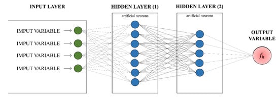 For the purpose of this study, the MATLAB program was used for designing the neural networks’ structures and learning algorithms as: gradient descent algorithm, conjugate gradient algorithm, and the Broyden–Fletcher–Goldfarb–Shanno and Levenberg–Marquardt algorithms. It also allows the use of 5 types of hidden layer activation functions and output layer activation functions. During ANN modelling, calculations were made for all possible combinations of the above-mentioned network elements. In addition, the number of hidden layer neurons was changed in the range of 1 to 15. We changed the number of layers of hidden neurons to 2 and again edited the number of neurons in layer 1 and layer 2 in the range of 1 to 15. Each of these functions processes the data using the corresponding Formulaes (4)–(8):