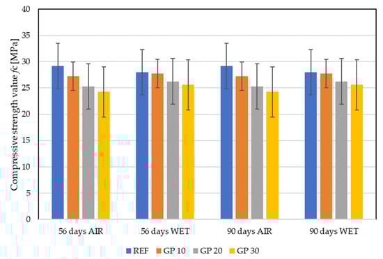 The samples were compared with each other based on the amount of granite powder added to partially replace the cement, as well as based on the maturation conditions of the samples. Figure 4 shows the average compressive strengths obtained when testing each of the sleepers. The basic requirement for cementitious composite substrates in terms of compressive strength is to achieve a minimum value of 20 MPa. It can be seen that all of the samples made reached the minimum value; therefore, the results obtained were used to make a database. From the graph, it can be seen that, as the amount of granite powder in the mix increases, the compressive strength of the substrate decreases, but even for the samples with the highest filler content, the substrate achieved the required strength.