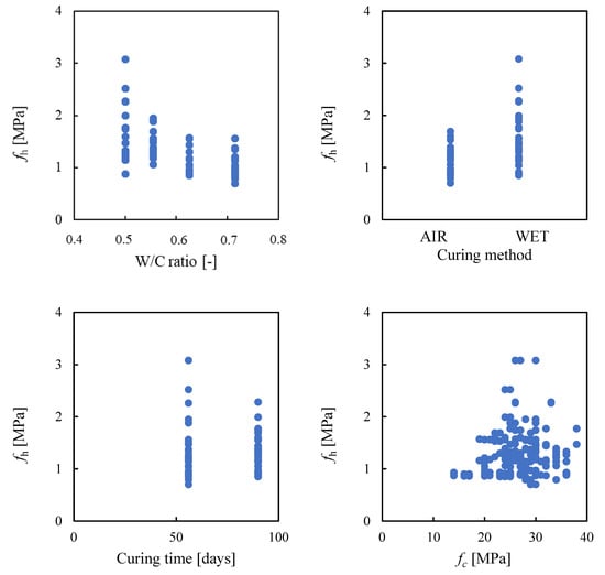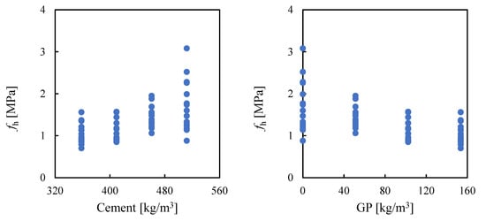 However, when another material is added to cementitious composites, it is necessary to evaluate how it affects their properties. Most of the tests used for evaluating the materials’ properties in civil engineering are destructive; therefore, they are costly and time-consuming, and they produce wastes. Therefore, sometimes for this purpose, the nondestructive tests are reasonable substitutes []. It is also important while performing such tests in buildings which are operating or which are characterized as historical heritage sites and cannot be tested destructively []. It was previously shown that an NDT method such as the Schmidt hammer method was successful in evaluating the compressive strength of concrete [,]. However, there is an issue with evaluating the other properties of cementitious composites such as subsurface tensile strength. For this purpose, very often, a method such as the pull-off test is used, but, after the test, the sample needs to be repaired, which makes this method not fully nondestructive []. However, it is still possible to try to correlate the compressive strength with the subsurface tensile strength. Therefore, it is possible to try to evaluate the opposite, which means that it is possible to evaluate the subsurface tensile strength using a Schmidt hammer []. Evaluating the subsurface tensile strength in cementitious composites such as mortars dedicated for floor substrate is very important because of the fact that, very often, these parameters are responsible for the durability of the element [].