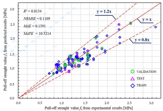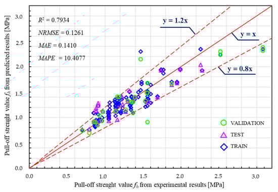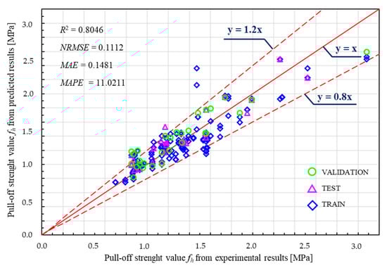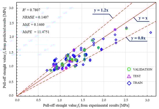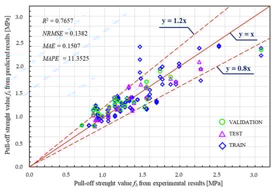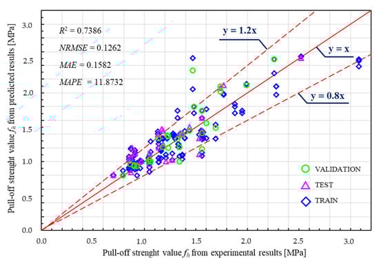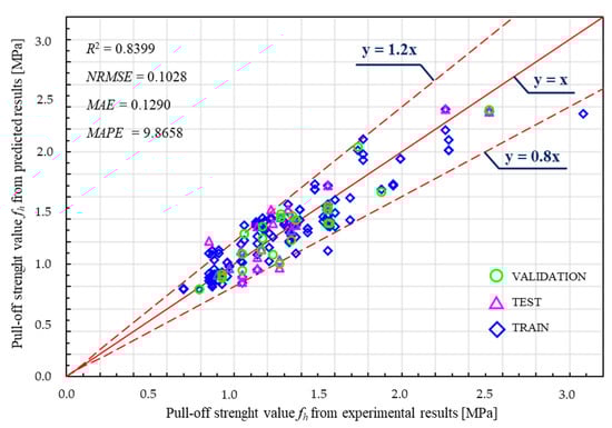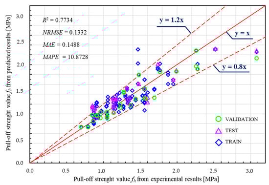 Figure 9 illustrates the results of the predicted values of the pull-off strength in relation to the results obtained by the experimental method using the Levenberg–Marquardt learning algorithm with one layer of hidden neurons. With this algorithm, the best ability to predict the subsurface tensile strength of cementitious composite containing granite powder was obtained for a network with seven hidden-layer neurons. It obtained the following network fit evaluation indices: , , , and Figure 8 shows the results for the learning process (blue rhombuses), the testing process (pink triangles), and the validation process (green circles). The red solid line with the function represents a perfect match while the dashed lines represent the 20% error area. About 9% of the results are outside this area.