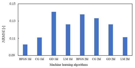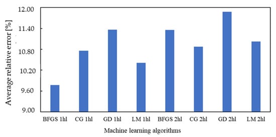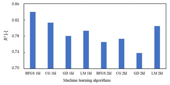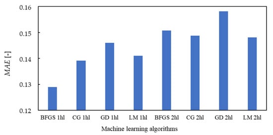 The machine-learning algorithms used in the article are accurate in predicting the subsurface tensile strength of green cementitious composites. This can be concluded from the values of the parameters determining their accuracy, which were R2, NRMSE, MAE, and MAPE. Figure 15, Figure 16, Figure 17, Figure 18 and Figure 19 and Table 4 compare the above algorithms. It can be seen that all the models tested predict the tensile strength of green cement composites well. The BFGS algorithm with one layer of hidden neurons performed best. However, since none of the models were perfectly accurate (R2 would be equal to 1; and NRMSE, MAE, MAPE, and relative error would be equal to 0), there is still room for improvement in the algorithms by building other databases or using other algorithms.
