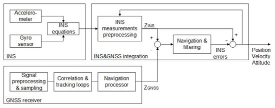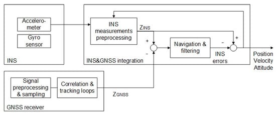 In most cases, INS/SNS measurements are integrated using the filtering algorithm in loosely coupled, tightly coupled and deeply coupled integration schemes. In loosely coupled and tightly coupled integration schemes, the difference between INS and SNS measurements is used to estimate the INS error, and then the INS navigation solution is corrected with resulting INS error estimate [,] (Figure 1 and Figure 2). In the case of a loosely coupled scheme, the difference between the position and velocity measurements obtained by GNSS and INS is used. In the case of a tightly coupled scheme, the difference between the pseudorange, carrier phase or Doppler shift measurements obtained by GNSS and INS is used.