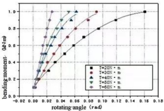 Bending moment–rotation angle curve of nodes under different torsional moments.