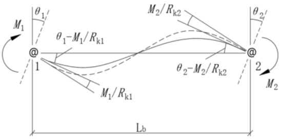 As shown in Figure 5, the two ends are semirigidly restrained with lateral shift of the crossbar, is the length of the crossbar, and are the turning angles of the two ends of the crossbar, and and are the turning stiffness of the crossbar nodes. Under the action of end moments and , the relative turning angles of the left and right ends of the crossbar are and , respectively.