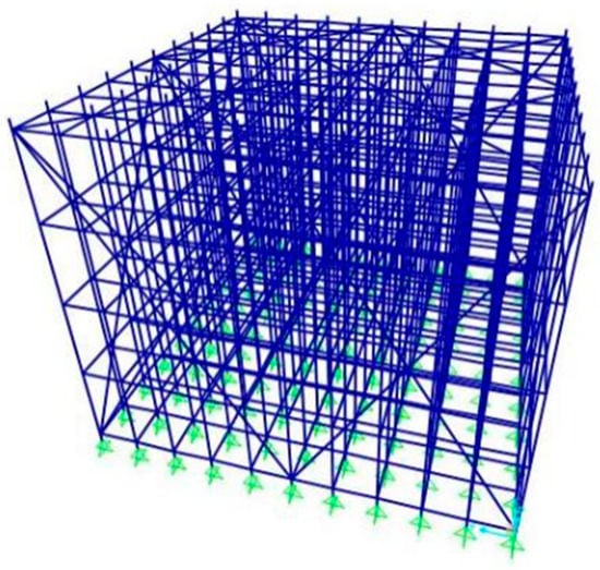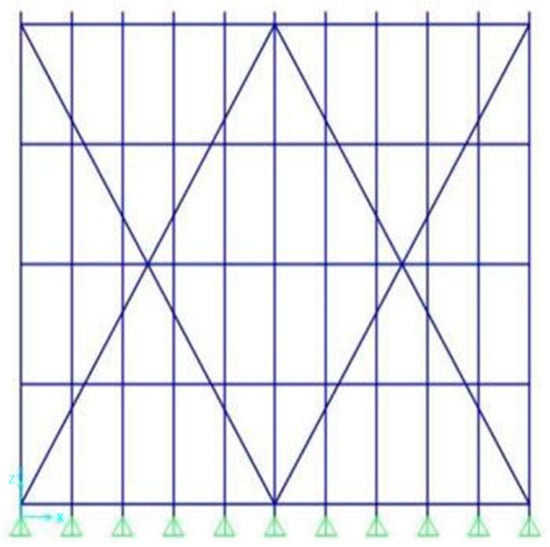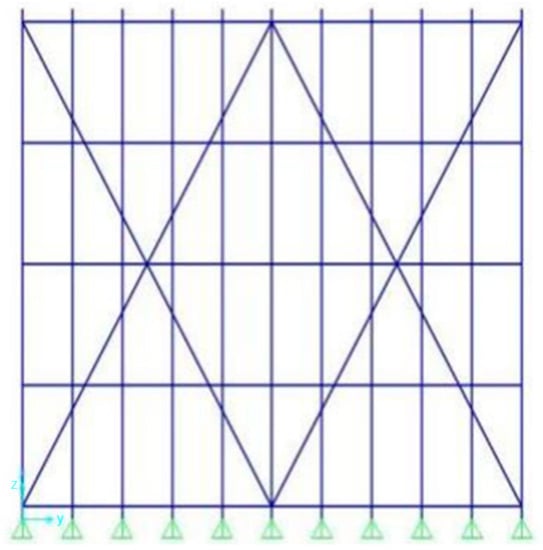 In accordance with the “Safety Technical Specification for Fastening Steel Pipe Scaffolding for Building Construction” (JGJ130-2011) and the requirements of Du Rongjun [32] on the setting of scissor bracing, considering the actual situation at the construction site, a finite element model of fastening steel pipe formwork bracket with different erection parameters is established; the top projection height of the erection model is 0.2 m, the height of the sweeping rod is 0.2 m, the specific erection parameters are shown in Table 10, and the finite element model is shown in Figure 6, Figure 7 and Figure 8.