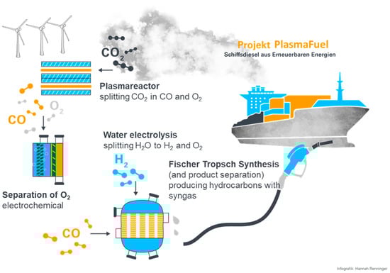 The PlasmaFuel joint project (2018–2022) in EiV, which includes the Institute for Photovoltaics (ipv) at the University of Stuttgart, dealt with the plasma-induced production of fuel for shipping. In a PtL process using electricity from renewable energies, plasma-induced CO2 splitting is linked to fuel production via the Fischer–Tropsch synthesis (FTS), as shown in Figure 1. In this project, the plasma-based splitting of CO2 into carbon monoxide (CO) and oxygen (O2) through a dielectric barrier discharge (DBD) and a variation of a gliding arc discharge (GA) was carried out. Through subsequent oxygen separation, the CO was synthesized together with electrolysis-H2 in a Fischer–Tropsch reactor to form marine diesel. The energy required for this was supplied by excess wind power.