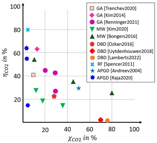 In a comparative study from 2021 by Renninger et al., experimental studies on plasma-based CO2 splitting were considered and compiled []. Only studies that achieved comparatively high conversions and/or efficiencies for the individual technologies were included. Minor extensions were made to the original diagram; the adjusted diagram is shown in Figure 2.