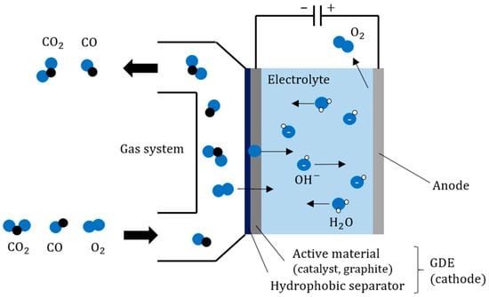 The gas diffusion electrode currently under investigation uses graphite as the support and manganese dioxide (MnO2) as the catalyst for oxygen reduction catalyst. MnO2 is a weak catalyst commonly used in air-fed batteries. It is an electrochemical separation process of oxygen (O2) from a mixed gas stream of predominantly carbon dioxide (CO2) and carbon monoxide (CO), and the catalyst used is selective for the reduction of O2. Oxygen is transported through the electrolyte in the form of OH− ions. Due to the high conductivity of aqueous electrolytes, the system can achieve high current densities at low temperatures (T < 90 °C). By using a carbonate-based alkaline electrolyte, side reactions with the electrolyte are mitigated. Using a hydroxide-based electrolyte might work better initially, but they will quickly react to carbonates in situ.