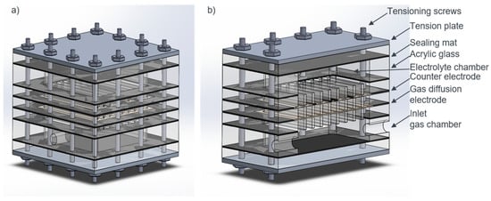 Technical design of a gas diffusion electrode device for the removal of oxygen. (a) Full construction. (b) Sectional view to show the layers as well as inlets and outlets.
