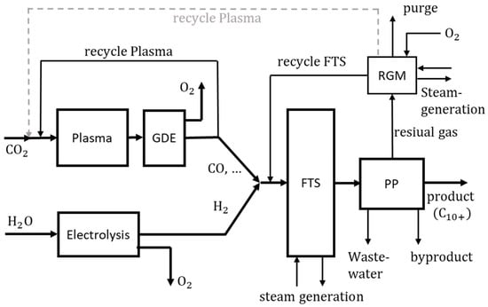 Block flowsheet of the modeled process consisting of the plasma-reactor, gas diffusion electrode (GDE), electrolysis, Fischer–Tropsch synthesis reactor (FTS), product preparation (PP), and residual gas management (RGM).