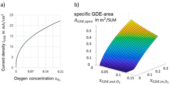 In the model, the necessary power to extract the oxygen after CO2 splitting was calculated through the formula in (4). Because is not meant for determining equipment costs in GDE because of the changing current density while reducing the oxygen concentration , the GDE area must be calculated, which is necessary to separate the desired amount of oxygen. For the determination of , a characterizing size of the GDE was defined, the , which describes the GDE area per standard liter per minute []. It is a function of the current density curve as well as the concentrations and . To determine the specific area of the GDE, iterative calculations were carried out, in which small GDE elements were considered and combined to form an area. The calculations were integrated into the simulation block via a map. For the creation of the map, measurements were performed on the GDE. A container filled with air was connected to the GDE and oxygen was separated by varying the temperature and voltage . Under ambient pressure , curves of the current density above the partial pressure of O2 were obtained. The determination of was found in MATLAB. Figure 7a shows a fit function of the measure performed in the lab at T = 80 °C and . The map resulting from the current density diagram is also shown in Figure 7b.