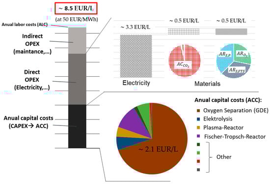 In their paper from 2016, Albrecht et al. also showed techno-economic results for power-to-liquid plants with Fischer–Tropsch synthesis with an RWGS reaction for CO2 splitting []. They obtain fuel costs between EUR 2.2 and EUR 2.8/L as a result, with a 60% share of electricity costs.