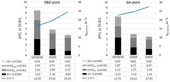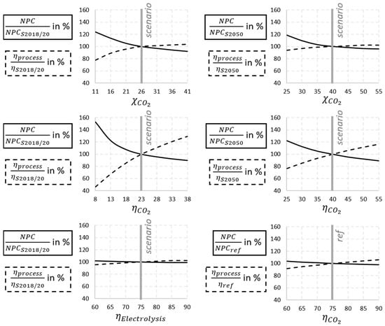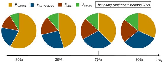 The recycle streams were also varied. In Table 9, the main parts of the as well as the process efficiency of scenarios 2018/20 and 2050 are shown without the use of recycle streams. The are 1.7 times bigger than the scenario values with recycle streams.
