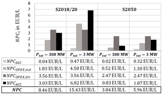 In further sensitivity analyses, different plant sizes were compared. In Figure 13, for scenario 2018/30 and scenario 2050, the parts of the are shown for a 300 MW and a 3 MW plant. It is obvious that the are rising because of the used cost functions and the lost of economy of scale.