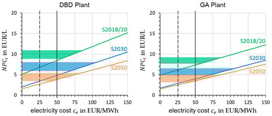 Net production costs (NPC) by varying the electricity cost. The solid vertical line shows the assumption made in the results of the scenarios. The dotted vertical line that of the ICCT scenario described in the text.