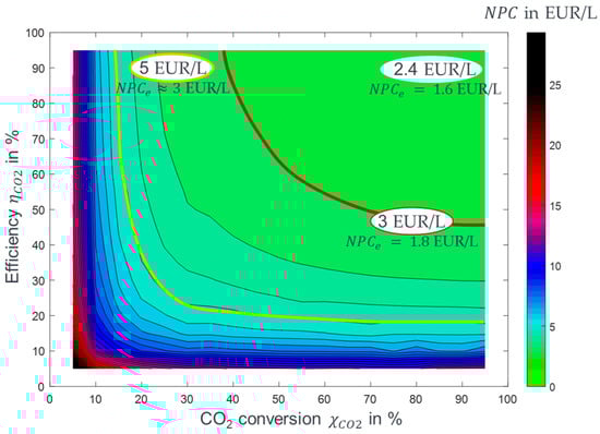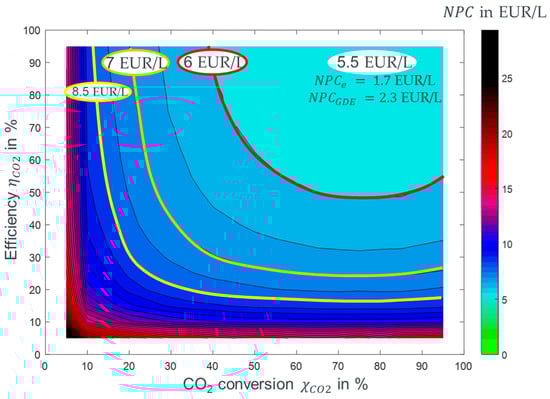 At low values of both and , unilateral optimization does not have a large impact on the overall performance and, thus, on the NPC. Until the line highlighted in orange at EUR 5/L, there is a high slope of the cost development. This limit can be undercut when reaching . To reach the value of the fuel costs determined in the Concawe study, conversions and efficiencies must be developed to a level above the red line shown []. To get below this cost, efficiencies of at least 45% and revenues of at least 40% must be achieved. By optimizing the GDE and using more efficient compressors and pumps, the efficiency can theoretically be further increased and, thus, can also be achieved. If the efficiencies of the compressors, turbines, and pumps increase from 80% to 85%, the process efficiency increases by , which enables an minimum of EUR 2.2/L. Further cost savings are only feasible through more energy-efficient oxygen separation.