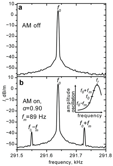 The effect of the application of amplitude modulated AC magnetic field to the SP tip is shown in the spectrum of cantilever oscillation in Figure 2. Here the carrier frequency is 100 MHz. In non-modulated magnetic field (Figure 2a), only a peak is visible at , which is the oscillating frequency of the cantilever near its resonant frequency . On the other hand, in amplitude-modulated magnetic field (Figure 2b), two sidebands , which are caused by the frequency modulation of cantilever oscillation, appear at (Figure 2b). The intensity of the oscillation does not change with and without amplitude modulation.