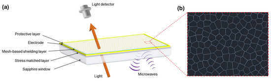 The transparent EMI shielding window, shown schematically in Figure 1a, is composed of a sapphire substrate and two layers of metal mesh films on its surface. Sapphire is chosen for its excellent physical properties, including high infrared transparency, good thermal conductivity, high hardness, and the ability to withstand high temperatures [31]. The thickness of the Au mesh layer is designed to be between 200 and 300 nm, which is sufficient to provide good conductivity for effective microwave reflection. The Cr mesh is used as the adhering layer and is much thinner than the Au mesh. In addition to the mesh-based shielding films, a layer of Al2O3 is used as a covering layer to protect the mesh film from erosion in harsh environments.