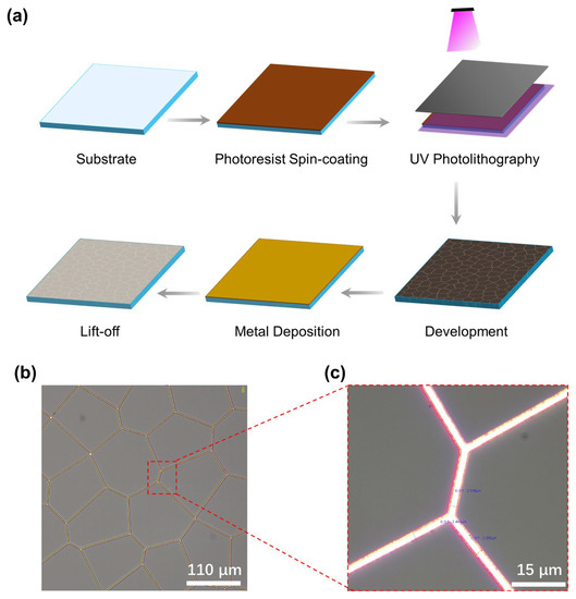 Metallic mesh films can be fabricated using various methods, including photolithography [26,33], printing [34,35], nano-imprinting [36], and laser direct-writing technology [29]. To obtain meshes with fine lines, a mature process of ultraviolet (UV) photolithography was adopted in this study to prepare the samples. The specific fabricating process is illustrated in Figure 2a. First, positive photoresist (AZ 5214E) was spin-coated onto the cleaned sapphire substrate. Then, photoresist film (~2 μm in thickness) with mesh patterns was obtained after exposure and the development process. Afterwards, metal films (Cr/Au) were routinely deposited by a magnetron sputtering system (PVD75, Kurt J. Lesker) in the presence of argon with a base pressure of 3.0 × 10−6 Torr. Cr and Au deposition rates were 0.66 Å/s and 1.00 Å/s, respectively. The thin Cr mesh layer is provided for better adhesion of the grid layer to the sapphire substrate. The photoresist was then dissolved to reveal the metal meshes in accordance with the designed mesh pattern. Figure 2b shows the micrograph of metallic meshes under a magnification of 50×. It can be observed that the metallic wires are continuous and have no fractures, which ensures that the mesh coating has good electrical conductivity. According to Figure 2c, the average linewidth of the mesh is measured to be ~2.5 μm. The photolithography technology adopted in this work has high precision and can obtain narrow linewidths, resulting in minimal loss of transparency. Additionally, the process is stable, highly reproducible, and capable of batch production.