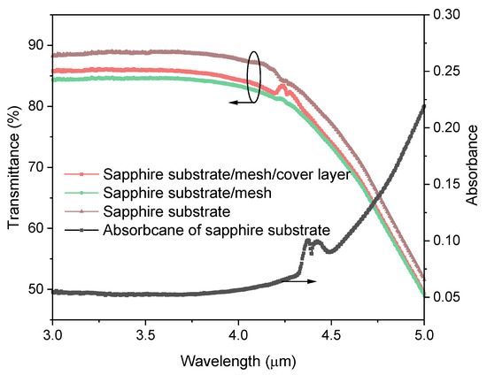 The optical transmittance of the sample in the mid-wave IR region (3–5 μm) was measured using a Fourier transform infrared spectrometer (FTIR-650S, Gangdong Sci & Tech, Tianjin, China) under ambient conditions. The IR transmittances of the bare sapphire window, the sapphire window with mesh coatings, and the sapphire window with mesh coatings and the covering layer are plotted in Figure 3. It can be seen that the bare sapphire window itself is highly transparent to IR light, exhibiting a high transmittance of 88.89% at 3.210 μm. Since the mesh has large effective apertures for light transmission, the infrared transmittance of the window decreased by only 4.14% after the mesh coating was fabricated. The most interesting aspect of the result is that the transmittance of the electromagnetic shielding window with a covering layer is slightly increased by 1.42% and reaches 86.17%, which can be attributed to the destructive interference [37]. As a result, the electromagnetic shielding layer reduces the window’s infrared transmittance by only 2.72%. With such a high transmission rate, the employment of the electromagnetic shielding window does not affect the detecting and imaging functions of optoelectronic system. It is worth noting that the IR transmittance starts to decrease at wavelengths greater than 4 μm and drops to ~48% at 5 μm. This is due to the increased IR absorption of Al2O3 in this region. In addition, it is worth mentioning that the transmission short-wave cutoff limit is about 0.19 μm [31]; the EMI shielding window possesses high visible light transmittance as well.