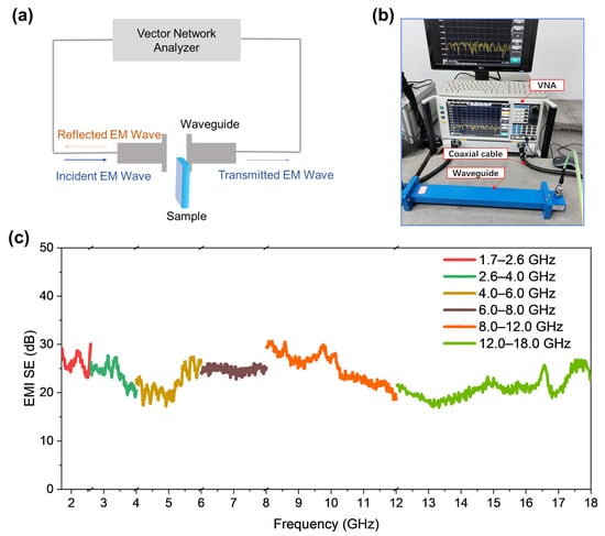 Attenuation of electromagnetic waves by shielding materials is quantified by shielding effectiveness, which is the logarithmic ratio of the incident power (Pi) to the transmitted power (Pt) [13]. Measurements of EMI shielding performance in this study were conducted over a wide frequency range of 1.7–18 GHz using the waveguide method [38], which is schematically illustrated in Figure 4a. The EMI shielding measurement setup consists mainly of a vector network analyzer (VNA, AV3672B, Ceyear, Qingdao, China) and waveguides, as shown in Figure 4b. The system was calibrated using the Transmission-Reflection-Load (TRL) technique before testing. As-prepared samples were firmly clamped between the commissures of waveguides, and different sets of waveguides operating in L-, S-, C-, X-, and Ku-band were utilized to achieve shielding performance across a broad frequency spectrum. EMI SE values can be obtained through S-parameters collected by the VNA. Since the ratio of Pi to Pt is the measure of electromagnetic transmittance, the total SE can be expressed as [13,29]: