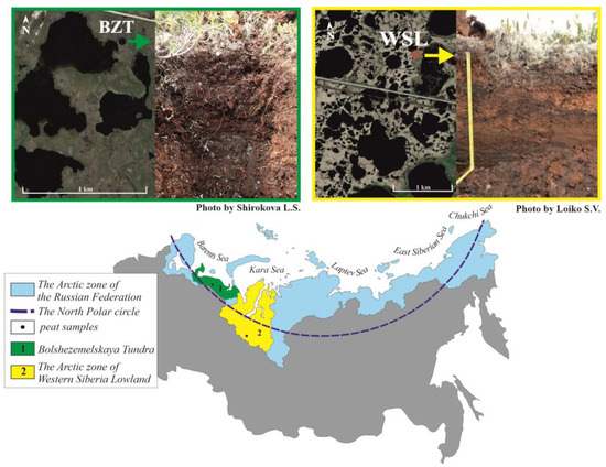 Location map of study area in the Bolshezemelskaya Tundra (1, BZT) and the Western Siberia Lowland (2, WSL), along with photos of sampled peat cores and their environmental context (flat-mound bogs with thermokarst lakes).
