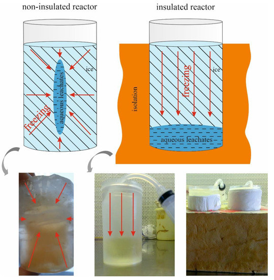 Freezing experiments were conducted in two main setups: with polyurethane insulation (approximately 10 cm around the jars and the bottom), and without insulation, as illustrated in Figure 2. Inside the plastic jar, we placed a flexible tube which was connected to a syringe and which allowed for the sampling of fluid in the course of the experiment. The freezing occurred from the borders to the center of the jar, in the case of no insulated reactors, and from the surface to the bottom, in the case of insulated reactors (Figure 2). As such, the sampling tube was located at the center of the jar, for the non-insulated reactors, and at the bottom of the jar, in case of the insulated reactors.