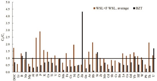 Preliminary examination of the concentration evolution in the course of freezing and thawing (in both directions) demonstrated that there was no significant (at p < 0.05) difference between the two treatments in terms of pH, DOC, major, and trace element concentration evolution. Progressive freezing of the aqueous peat leachates led to a decrease in pH relative to the initial solutions (Figure 3), as well as a general increase in DOC and element concentrations, but this increase was different among peat samples. Thus, a sizable—a factor of 2 to 3—increase in the concentration of most elements in the remaining fluid occurred during the freezing of leachates from the active (upper) layer peat of both Western Siberian (WSL) and NE European Tundra (BZT), shown as brown and black symbols, respectively, in Figure 3.