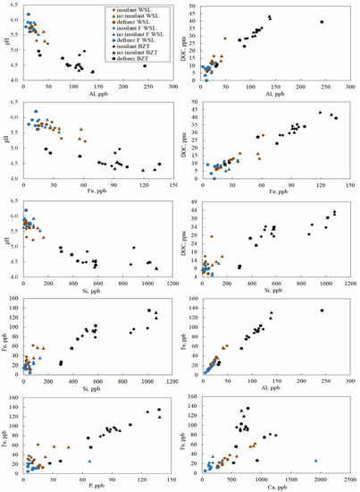 The correlations between element concentrations during freezing and thawing at different modes (with and without insulant, Figure 5 and Table 3) allowed for the distinguishing of two main groups of solutes: DOC, Fe, and Al as potential carriers of Si, P, K, Cr, Co, Ni, Cu, As, Pb, Nb, and trivalent and tetravalent hydrolysates, as well as Ca, Na, and K as major indicators of conservative solutes that did not exhibit any significant correlations with other solutes. It was found that while Fe, Al, and other trace metals, notably TE3+, and TE4+, exhibited strong correlations during freezing and thawing, the labile Na or Ca (as a major cation) did not correlate with Fe, Al, and DOC in any of the substrates. Note that the maximal number of elements correlated with three major components of the organo-mineral colloids (DOC, Fe, and Al) was observed in thawing rather than freezing experiments.
