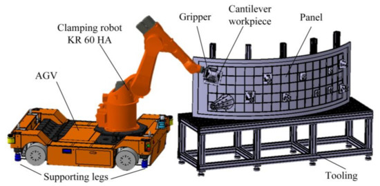 As shown in Figure 1, the large panel is a component sample of the space station cabin. Due to the good stiffness of the panel and tooling, they are considered a fixed boundary in this paper. When the AGV is well-positioned, the supporting legs will extend and support the AGV to improve the stability of the system. At this time, both the supporting legs of the AGV and the cantilever workpiece are in contact with the fixed boundaries, resulting in an approximate closed-loop structure of the ARGW system composed of AGV, clamping robot KR 60 HA, gripper, and cantilever workpiece.