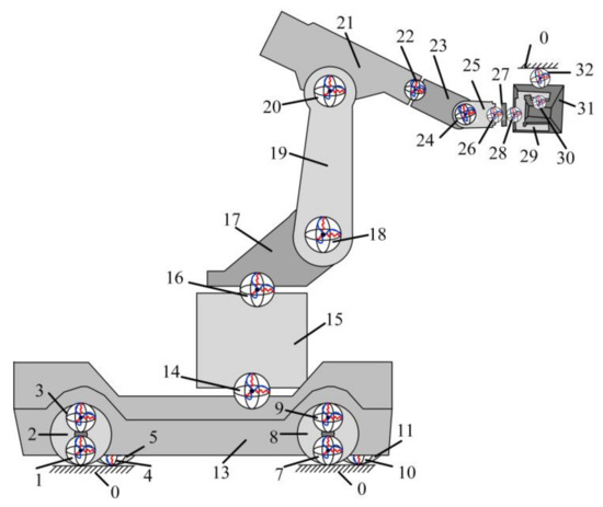 The dynamics model of the system is described in Figure 2, and its topology figure is shown in Figure 3. The four supporting legs, AGV, seven links of the robot, gripper, and workpiece are considered rigid bodies 2, 5, 8, 11, 13, 15, 17, 19, 21, 23, 25, 27, 29, and 31, respectively. Additionally, the hinge elements are numbered as 1, 3, 4, 6, 7, 9, 10, 12, 14, 16, 18, 20, 22, 24, 26, 28, 30, and 32 in sequence. The ground and the panel are fixed boundaries, all of which are numbered as 0. In addition, the workpiece machining surface is a free boundary, also numbered 0.