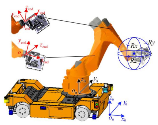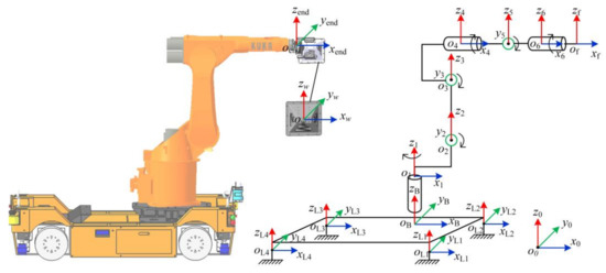 As shown in Figure 5, are the coordinate systems of four supporting legs, is the coordinate system of the AGV, are the six-link and flange coordinate systems of the robot, oendxendyendzend and owxwywzw are the end gripper and workpiece coordinate systems, respectively.