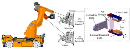 As shown in Figure 6, the gripper consists of a connecting plate, an air cylinder, two link reinforcement plates, two jaws and two central axes, in which the jaws can adjust around the central axis. Before clamping, the gripper is left open. When the configuration of the clamping robot is determined, the cylinder contracts to clamp the workpiece, and the jaws adaptively adjust the angles to fit the surfaces of the workpiece. The clamping force of the gripper on the workpiece is only related to the air pressure and cylinder performance, and will not change with the clamping position and clamping direction. When the spatial positions of the AGV and workpiece remain unchanged, the gripper can still clamp the workpiece through both the A and B directions. Apparently, the clamping robot has different configurations in the two directions of the gripper.