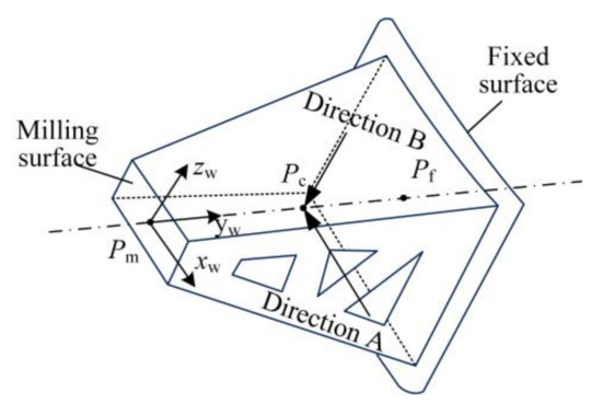 As shown in Figure 7, when the gripper is clamping the workpiece in direction A or B, the input points of two directions are equivalent to Pc. Additionally, Pc is located on the line over the output point Pm and the input point Pf, and its position is constant relative to Pm in both directions, A and B. Moreover, the dynamics parameters of the workpiece are unchanged; thus, the transfer matrix is also unchanged. Furthermore, since the fixed position of the workpiece is always unique, then the transfer matrix is also unchanged. In this case, the vibration responses of the workpiece are only related to and at different clamping robot configurations. In this paper, the acceleration of the Pm point in the owxwywzw coordinate system is used to represent the vibration response of the workpiece.