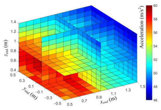 Similar to the presentation in Figure 9, the three axes are xend, yend, and zend, and the figure is composed of six faces too. However, the difference is that the vibrational response caused by the xendyendzend changes more regularly. The overall response showed a decreasing trend from the boundary of x = 0.5 m and z = 0.4 m to the boundary of x = 1.5 m and z = 1.4 m. It can be intuitively seen from Figure 11 that as the configuration of clamping robot changes, the overall responses of the workpiece vary from 46 m/s2 to 60 m/s2, and the change range reaches 14 m/s2. Compared with RxRyRz, the change in xendyendzend has a more obvious effect on the vibration suppression of the clamping robot. In addition, the responses of the workpiece decrease with the increase in zend, which is consistent with the result shown in Figure 9. Additionally, the effect of yend change on vibration responses is not as obvious as that of xend and zend. This is because the robot is approximately symmetric along yend = 0, and the configuration change caused by the of yend is not as obvious as that of xend and yend. In short, the law in Figure 11 shows that the closer the workpiece is to , the worse the vibration suppression effect of the corresponding configuration of the clamping robot is.