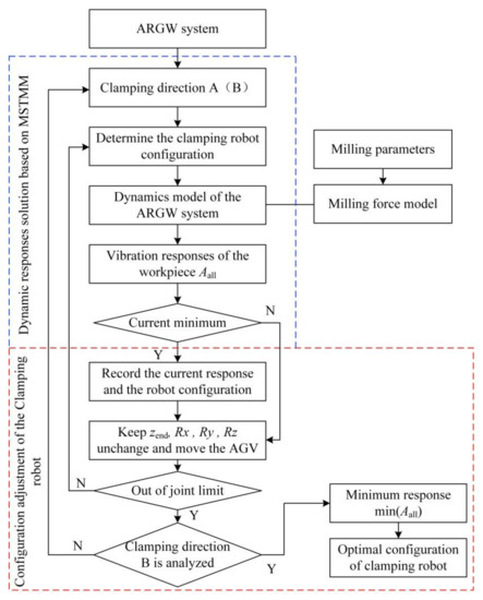 The configuration optimization process can be divided into two parts: dynamic responses solving and configuration adjustment, where configuration adjustment can be achieved by changing the clamping direction of the gripper and the position of the AGV. When the workpiece and its clamping direction are determined, the configuration of the clamping robot is only related to xend and yend. In addition, the current z′end and R′xR′yR′z need to be kept unchanged in the optimization of the same clamping direction. Additionally, the specific process is shown in Figure 12. The blue dotted box is the dynamics modeling and response analysis, the red dotted box is the configuration optimization part, and the milling force model is the external force input of the entire optimization process. Additionally, after each configuration change, a dynamic response solution is required.