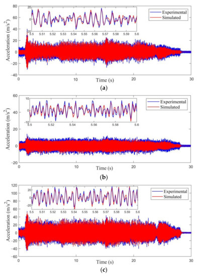 Figure 15a–c presents the responses in the xw, yw, and zw directions, respectively. From the acceleration responses in the three directions, it can be seen that the responses increase rapidly and then decrease at the beginning stage, and the responses in the middle stage tend to be stable, finally decreasing slowly at the end stage. This is because when the tool first enters the workpiece, the instantaneous excitation will make the workpiece produce a large response. As the tool moves away from the workpiece, the response decreases as the amount of cutting decreases. It can be seen from the local magnification diagram that the responses of the experiment and the simulation agree well overall. Specifically, the maximum error is 4.6 m/s2, appearing in the xw direction, whereas the average errors in the three directions are only 2.9%, 3.4%, and 2.3%. The comparative results demonstrate the accuracy of the dynamics model of the ARGW system. Moreover, the simulated responses are always smaller than the experimental responses in either direction. This is because there are various environmental noises in the experiment, while the simulation is carried out in an ideal environment without additional interfering factors.