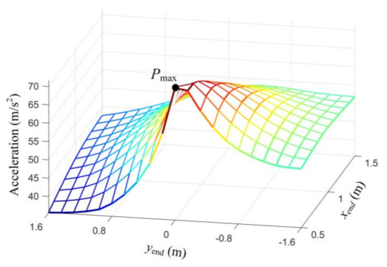 Figure 16 is the acceleration response plane when zend = 1.03 m in Figure 11. In order to show the amplitude of the response more intuitively, a vertical coordinate named acceleration is added in this figure on the basis of retaining color features. In addition, the two axes in the horizontal plane are xend and yend. The responses in Figure 15 show a trend of gradually decreasing from the highest point Pmax to the surrounding, and its overall change law is almost consistent with that shown in Figure 11. Under current conditions, the response is up to 67.98 m/s2 of the Pmax, and the response can be reduced by 45.35% to 37.15 m/s2 after configuration optimization of the clamping robot. At the maximum response point Pmax, the corresponding xend of the clamping robot is only 0.5 m, and yend is basically close to 0 m. At this time, the gripper of the robot is closest to the base as shown in Figure 16. Therefore, in order to obtain a better vibration suppression effect, the configuration of the clamping robot should be as far away from Pmax as possible.