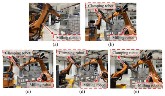 According to the simulation result, a series of experiments are carried out to verify the accuracy of the response prediction and the effectiveness of the configuration optimization method. Including a group of non-clamping experiments and four groups of clamping experiments with different configurations, the experimental scenes are shown in Figure 17. The configuration of the clamping robot in Figure 17e is the optimized configuration, while Figure 17b–d shows the controlled experiments with three groups of gradually decreasing responses.