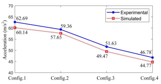 As can be seen from Figure 18, the response gradually decreases as the Config. 1 runs to Config. 4, which is consistent with the change in the response prediction result observed in Figure 16. Moreover, the experimental responses are 2.55 m/s2, 1.71 m/s2, 2.16 m/s2, and 2.01 m/s2 larger than the simulated responses, respectively, which agrees with the comparison results in Figure 15. The above results also verify the accuracy of the response prediction based on the ARGW system dynamics model. The response corresponding to the optimized Config. 4 is the smallest of the four sets of configurations. The experimental result is 46.78 m/s2, and the simulation result is 44.77 m/s2. Furthermore, the simulated and experimental responses were reduced by 15.37 m/s2 and 15.91 m/s2 after configuration optimization, demonstrating the effectiveness of configuration optimization in improving the vibration suppression effect.