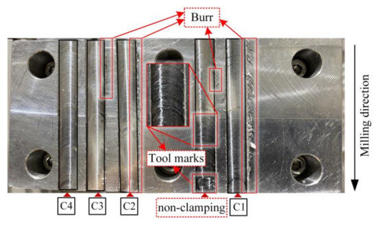 The milling experiment effects of different configurations are illustrated in Figure 18; in addition, the surface roughness of the corresponding milling path is listed in Table 3. Additionally, C1 to C4 are abbreviations of Config. 1 to Config. 4.