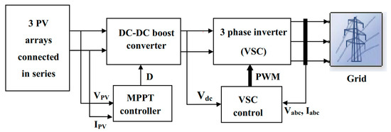 The PV system topology in this study is depicted in Figure 1. It is a large-scale, three-phase, grid-connected system composed of a PV array, a DC-DC boost converter with an MPPT controller, and a three-phase VSC inverter. The PV array consists of 60 parallel strings, each composed of 5 modules connected in series, and it is rearranged into three PV arrays connected in series. The system is designed to generate a maximum output of 100.37 KW under Standard Test Conditions (STC) (irradiance 1000 KW/m2 and temperature 25 °C).