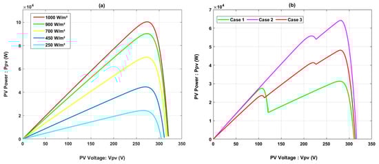 Figure 2a illustrates the effect of uniform solar radiation on the P-V curves of the PV array. As the irradiance increases, the generated power also increases and vice versa [28]. There exists a single point, referred to as the MPP, where the power generated is at its maximum, and to operate the PV array at this point, the impedance of the PV and the load must be matched with the use of an MPPT tracker [29].