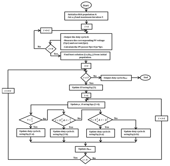 The proposed modifications to the traditional RSA algorithm make it suitable for use in MPPT of PV systems. The algorithm continuously reads the output voltage and current of the PV array, as depicted in the flowchart of the algorithm in Figure 3. This information is then utilized to calculate the output power, which serves as a validity function that helps to update and determine the next duty cycle of the boost converter until the optimum duty cycle () is reached. The RSA algorithm employs two main techniques, encircling and hunting, to update the position of the candidate duty cycle (). The following sub-sections will elaborate on these techniques and provide a detailed mathematical model.
