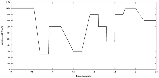Under uniform solar illumination, the level of radiation received by PV arrays is consistent, but it undergoes gradual and rapid variations over time. The irradiance profile utilized in this simulation to test the Proposed RSA algorithm under USI conditions is presented in Figure 4. The ambient temperature is maintained at a fixed value of T = 25 °C. As shown in the figure, irradiance changes successively and rapidly between different high and low levels, with both small and wide variations. For instance, there is a gradual decrease in irradiance from 1000 to 250 KW/m2.