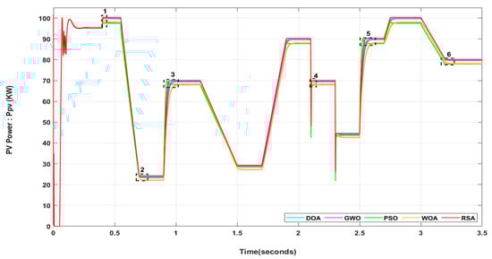 At t = 0.55 s, a wide variation occurred when the irradiance gradually decreased from 1000 to 250 KW/m2. The RSA algorithm achieved the highest efficiency of 99.47%, followed by PSO, DOA, GWO, and WOA, with efficiencies of: 98.79%, 97.68%, 95.92%, and 90.87%, respectively. The RSA-MPPT tracker settled at the MPP in the shortest time, taking only 25 ms, compared to DOA, WOA, GWO, and PSO, which took 40 ms, 60 ms, 50 ms, and 50 ms, respectively. The results demonstrate that, in both cases of rapid increase and decrease in PV irradiance, the power extracted by the RSA algorithm was the closest to the theoretical values, with good tracking rapidity and the highest efficiency of around 99.98%. The other tested algorithms were slower in finding the optimal MPP, and their efficiencies ranged from 90.87% to 99.83%.