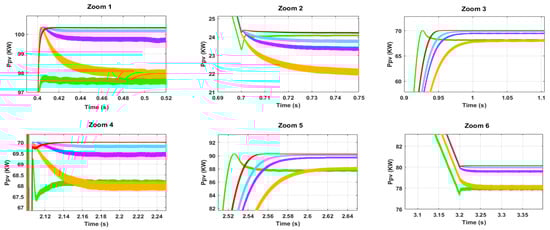 The comparison of simulation results is depicted in Figure 5, with certain portions of the resulting power curves being magnified in Figure 6 to enable a more thorough evaluation of the performance of the proposed RSA-MPPT algorithm. A comprehensive analysis of the algorithm’s performance is presented in Table 2, including the power extracted at the MPP, settling time, power efficiency, and steady-state oscillation.