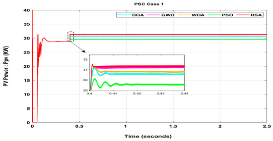 Case 1: The first PV array (PV1) in this case is subjected to a different irradiance level compared to the other two arrays, resulting in a power voltage curve with two peaks and only one global peak at a power level of 31.37 KW, as shown in Figure 2b. The simulation results in Figure 7 demonstrate that the RSA-MPPT based algorithm achieved the global maximum power point (GMPP) with the highest efficiency of 99.94% among all the tested algorithms, followed by GWO with 99.71% and WOA with 98.15%. DOA obtained an efficiency of 97.45%, while the PSO algorithm had the least efficiency of about 94.23%. Furthermore, the RSA algorithm was the fastest in settling at the global peak in less than 10 ms, while the other algorithms took more time due to the fluctuations they exhibited.