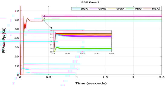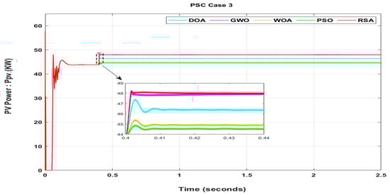 Based on the simulation results presented in Figure 8, the RSA-MPPT algorithm outperformed the other algorithms. It achieved a convergence to the GMPP of 64.15 KW with 99.94% efficiency in just 16 ms. The WOA algorithm maintained a high efficiency rate of 99.32% in 25 ms, while the GWO method achieved a 99.07% efficiency rate in 20 ms. The DOA technique sustained an efficacy of about 98.61% in 35 ms, whereas the PSO algorithm attained a 93.35% efficiency in 20 ms. As seen in Figure 8, DOA, WOA, and PSO algorithms exhibited less fluctuation compared to the previous case of PSC.